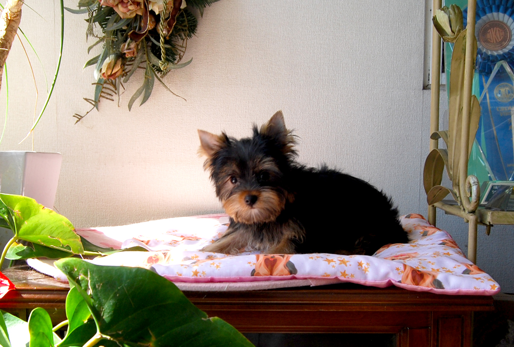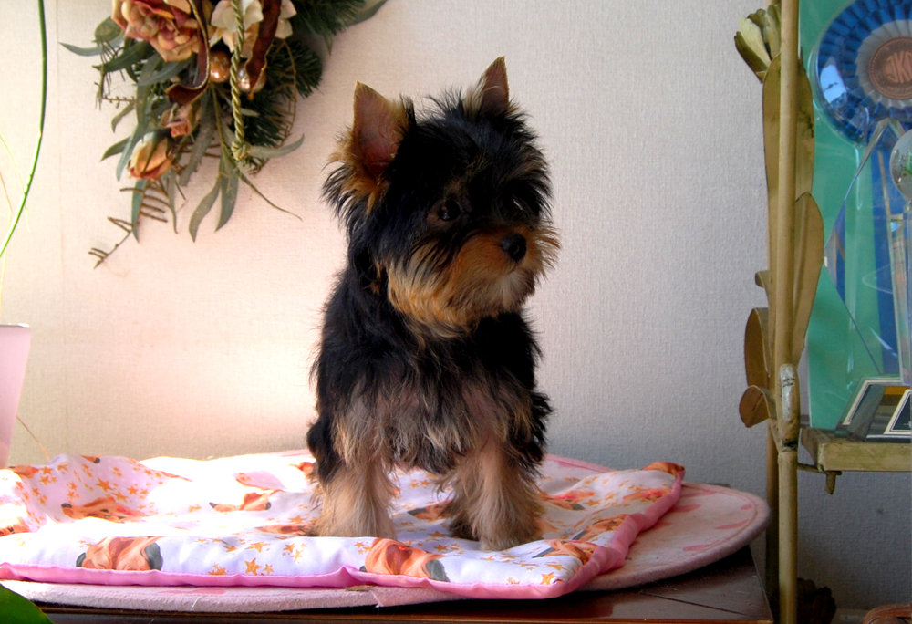 良いヨーキの子犬の見分け方の説明に使うタイプ 「足、首が長く、鼻は短く、小さい耳 小顔で目が綺麗 毛の質はシルキー、色はこのまま成長すれば理想的」 と、書くことの出来る男の子 聡明で明るい性格 ロシアの血液の母親に小さなロシア系の父親 最高の組み合わせ 将来の予想体重:約2.6kgぐらい 展覧会に興味ある方にもお勧め 体つきは、がっちりと健康的です |
